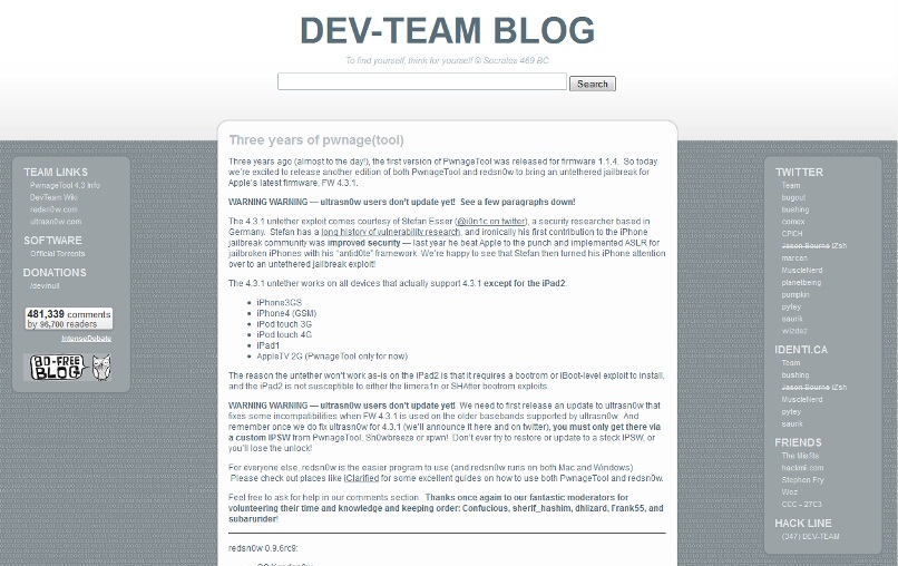 Et voila les amis, c’est via le blog de la DEV-TEAM, que tous les adorateurs de jailbreak iPhone doivent connaître que nous avons droit ce matin au jailbreak Untethered iOs 4.3.1 pour tous les appareils SAUF l’iPad2.
